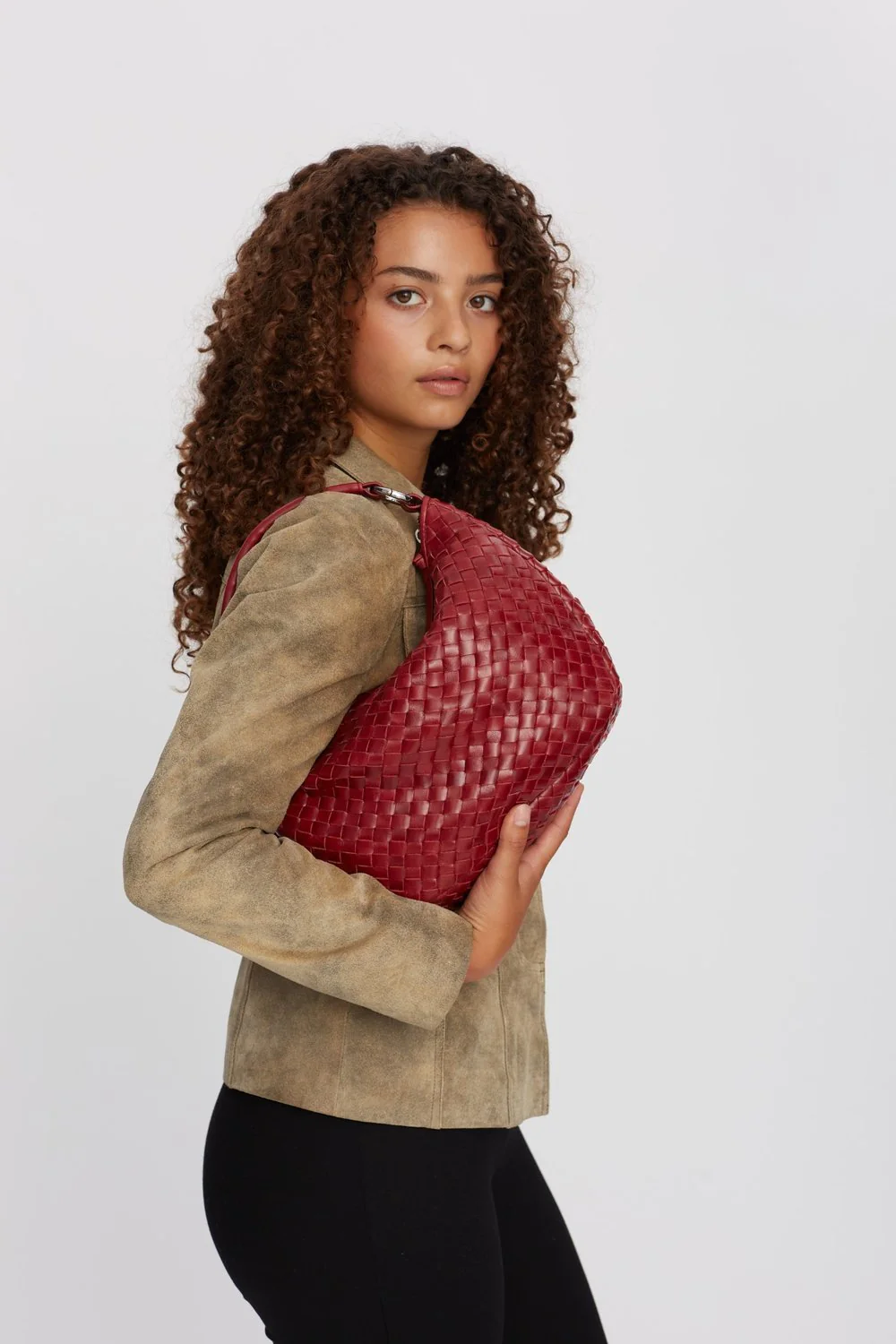 An elegant shoulder bag in a beautiful woven design. It features two detachable straps: a shorter one for shoulder or hand carry, and a longer adjustable strap for wearing cross-body. Both straps attach seamlessly to the sleek metal rings, making it easy to switch up your look. The spacious main compartment is complemented by two interior pockets, including one with a zipper, offering both style and practical organization.